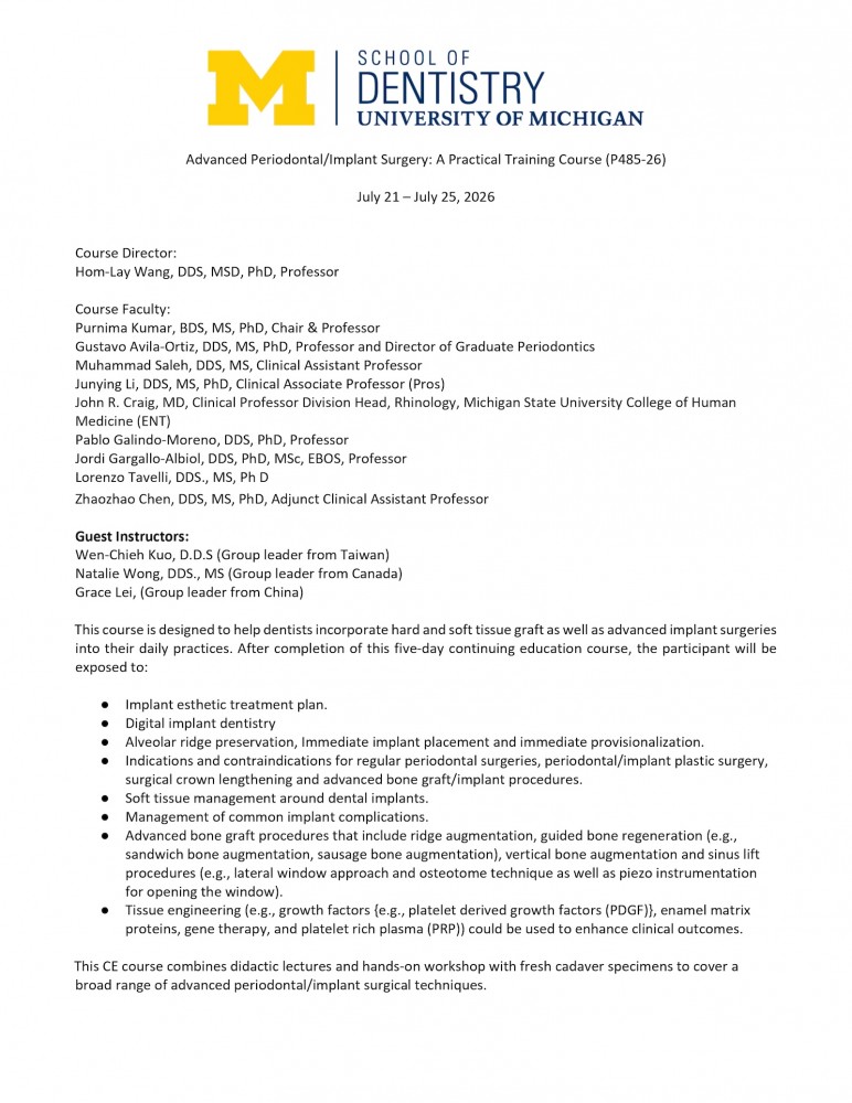 2026/7/21-25 密西根大學王鴻烈教授植牙進修課程
