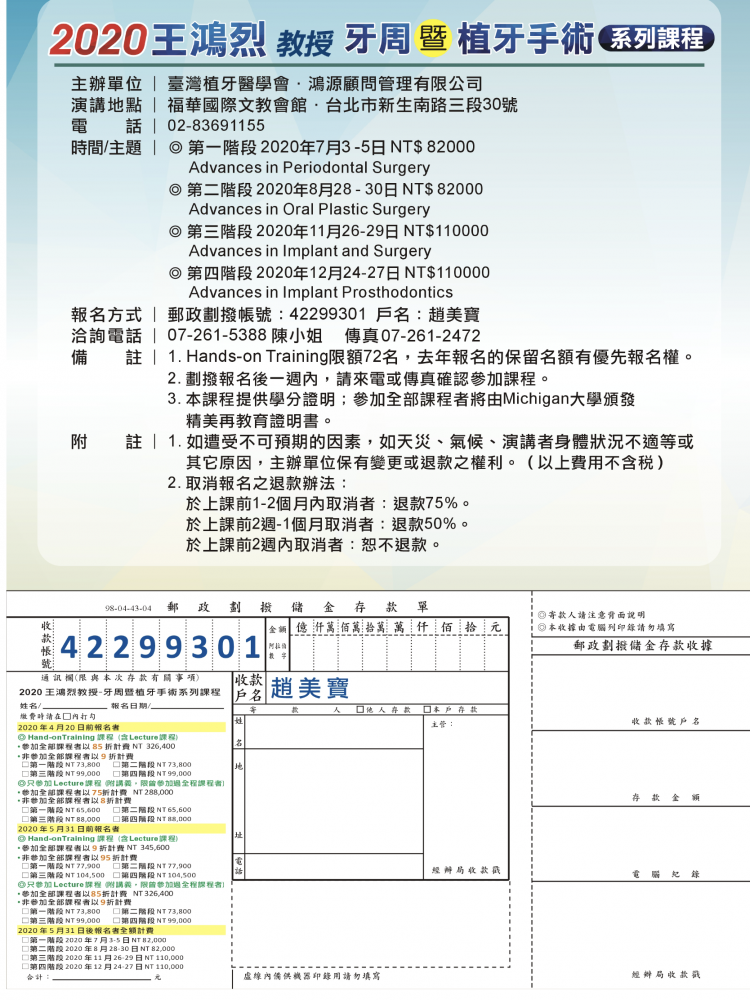 填寫完成後,請連同收據及牙醫師 證書傳真至台灣植牙醫學會,謝謝 聯絡電話:(02)2362-0026 傳真號碼:(02)2362-0035